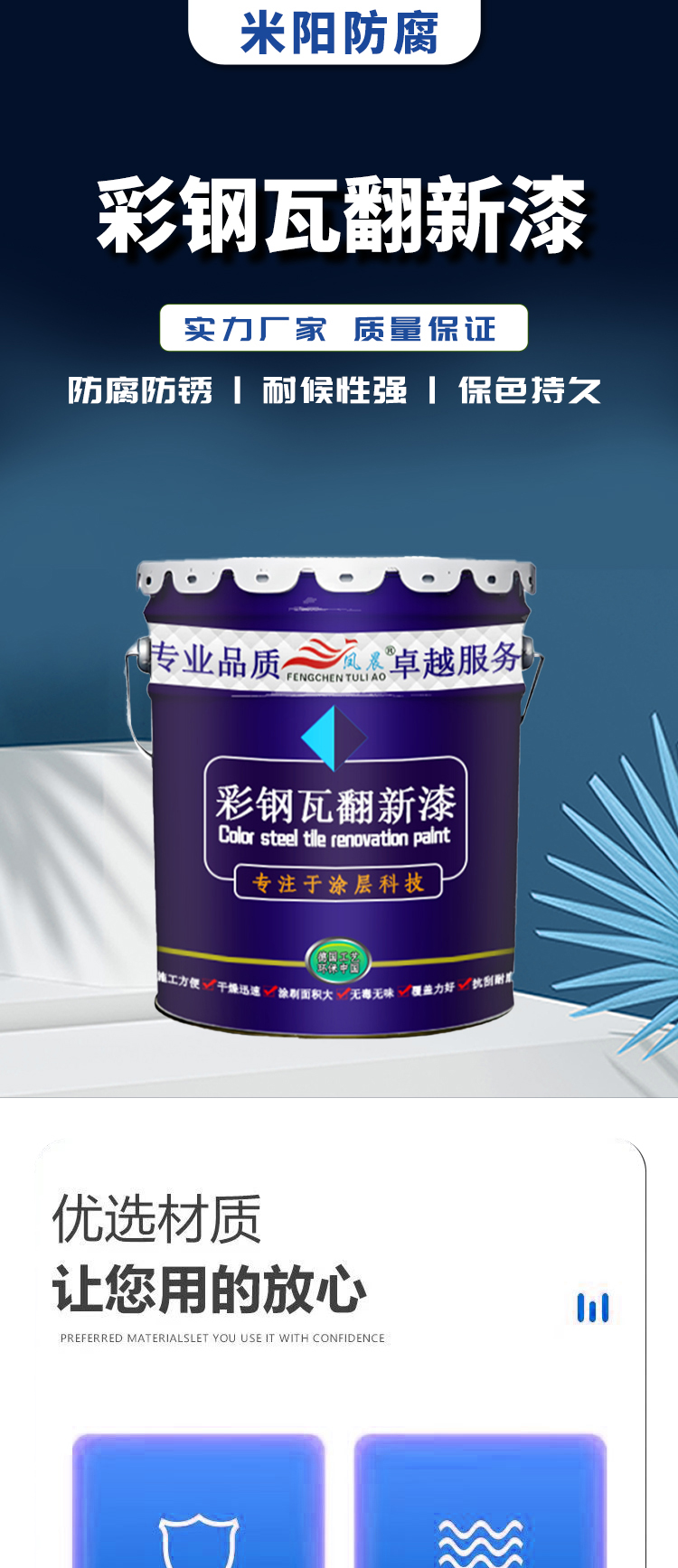 河北米阳防腐材料有限公司是以供应氟碳漆、环氧树脂、防锈油漆、彩钢瓦翻新漆等系列产品为主的多元化企业;形成了一套科学完整的管理体系,能为客户提供优质商品。我公司愿与新老客户精诚合作,携手共赢,谋求更广阔的发展,欢迎各方朋友前来洽谈咨询。
